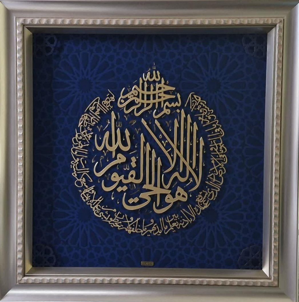Elegant Calligraphy: The “Ayat al-Kursi” verse is written in traditional Persian or Arabic calligraphy, symbolizing divine blessing and protection.