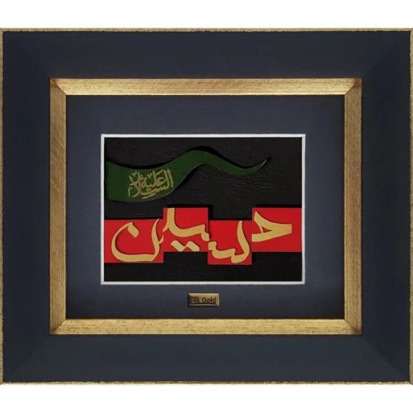 در مرکز تابلو، نام مبارک حسین (ع) با ظرافت خاص و به صورت برجسته کار شده است. انعکاس نور بر سطح طلایی و برجسته، جلوه‌ای خیره‌کننده ایجاد می‌کند و حاشیه‌های سنتی اطراف تابلو، این اثر را به یک قطعه هنری بی‌نظیر تبدیل کرده است.
