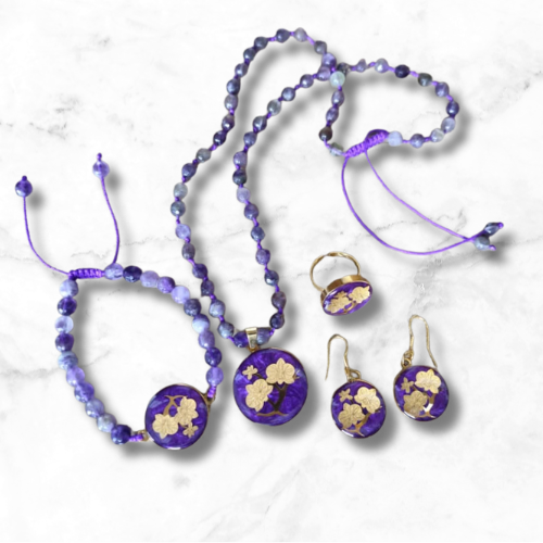 گل ارکیده نماد زیبایی جاودان است. ترکیب طراحی ارگانیک با سنگ بنفش درخشان باعث میشود این ست هم درخشش کلاسیک داشته باشد و هم مدرن بهنظر برسد.