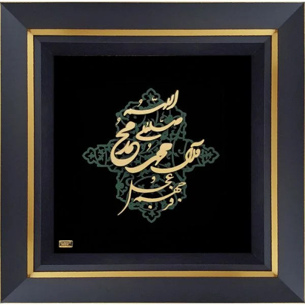 این تابلو شامل عبارت «صلوات بر محمد و آل محمد» است که با نقوش اسلیمی ظریف و درخشش طلا ترکیب شده و فضایی روحانی و آرامش‌بخش در هر محیطی ایجاد می‌کند.