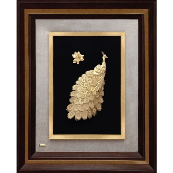 در این تابلو، تصویر باشکوه طاووس در کنار یک گل نمادین، نمادی از زیبایی، عشق و تعالی روح را تداعی میکند. استفاده از ورق طلای ۲۴ عیار در طراحی اثر، جلوهای لوکس و ماندگار به آن بخشیده است.