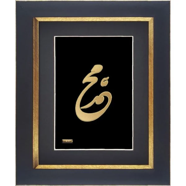 تابلوی محمد (ص) با خط نستعلیق چشمنواز، در مرکز قاب قرار گرفته است. سطح برجسته و براق حروف در کنار پسزمینهای هماهنگ و طلایی، جلوهای درخشان و سهبعدی ایجاد میکند. انعکاس نور بر روی خطوط طلایی سبب شده تا این اثر از هر زاویهای زیبایی خاص خود را حفظ کند.