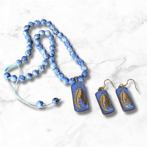 در این اثر، پر طلایی با سنگ طبیعی سودالیت تراش براق سایز ۸ همراه شده تا ترکیبی از آرامش، خرد و زیبایی طبیعی خلق شود.