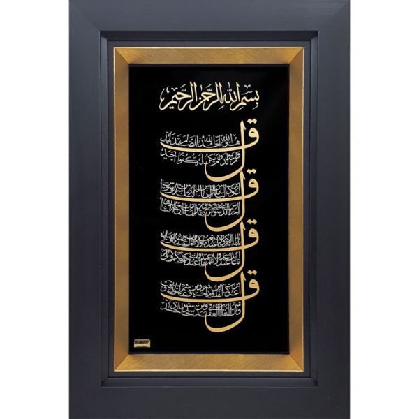 دکوراتیو چهارقل حک عمودی یک اثر هنری فاخر است که به‌طور ویژه با استفاده از طلا و حکاکی‌های دقیق خلق شده است. چهارقل که در قرآن کریم آمده است، در بسیاری از فرهنگ‌ها و جوامع اسلامی به عنوان یک آیه محافظ شناخته می‌شود. این آیات با قدرت معنوی خود از هر نوع بلا، انرژی منفی و آسیب‌های معنوی حفاظت می‌کنند.