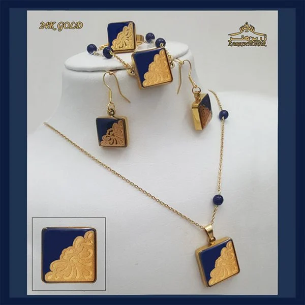 این ست شامل اجزای کامل از جمله گردنبند، گوشواره، دستبند و انگشتر است و با روکش ورق طلای ۲۴ عیار و پوشش رزین کاری شفاف و مقاوم ساخته شده تا درخشش و زیبایی خود را برای مدت طولانی حفظ کند.