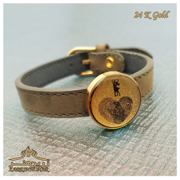 دستبند چرم اثر عشق با طراحی عاشقانه، استفاده از چرم باکیفیت و طلای ۲۴ عیار در پلاک مرکزی، گزینهای بینظیر برای هدیه به معشوق در روز ولنتاین است.