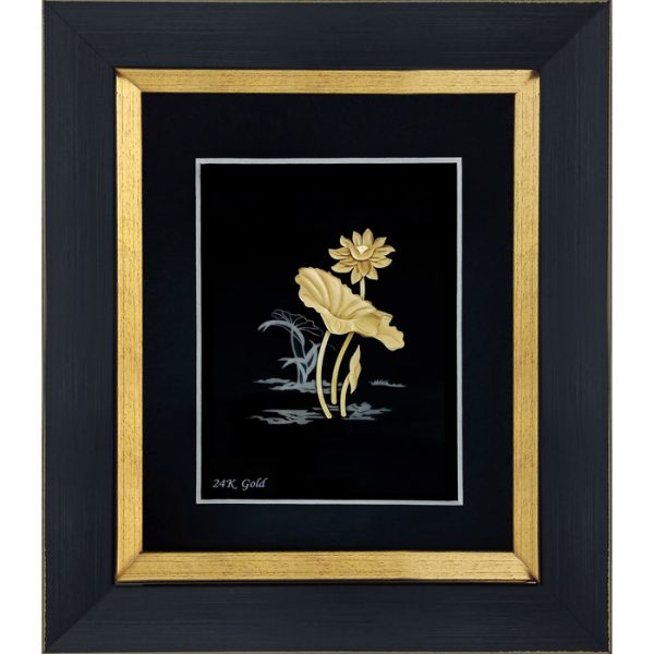 در تابلوی نیلوفر آبی، از ورق طلا برای نمایش شکوفایی گلها استفاده شده و در کنار پسزمینه تیرهتر، جلوهای چشمگیر و ماندگار ایجاد کرده است.